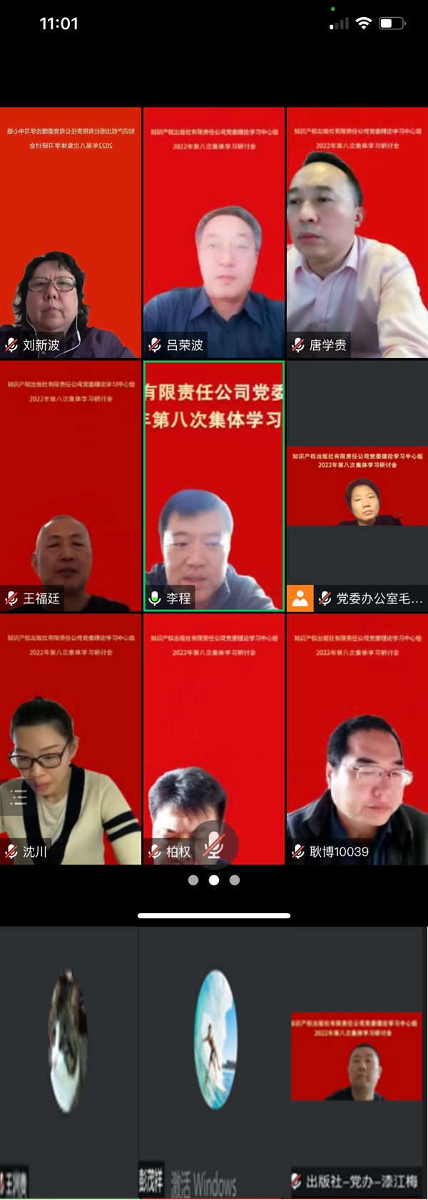 11月28日,知识产权出版社有限责任公司(以下简称出版社)党委理论学习中心组以线上方式召开2022年第八次集体学习研讨会,深入学习宣传贯彻党的二十大精神,社党委副书记、副总经理李程主持会议并提出工作要求,社党委理论学习中心组成员参加学习研讨。