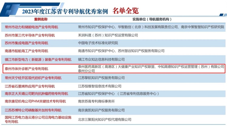 4月23日,苏州公司主导完成的“泰州市体外诊断产业专利导航”项目入选“江苏省2023年度专利导航优秀案例”,此次评选竞争激烈,苏州公司能首次获此殊荣尤为不易。本项目能入选省优秀案例,充分体现省局、地方政府以及社会各界对苏州公司的高度认可。